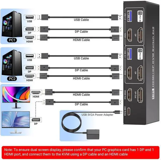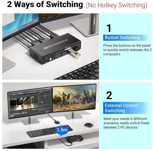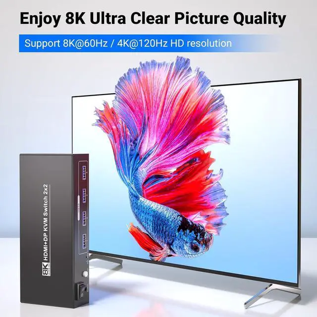 Are you tired of juggling multiple keyboards, mice, and monitors just to switch between 2 computers? Our 8K HDMI & DisplayPort 2 port KVM Switch is here to revolutionize your workspace. This dual port KVM switch lets you connect two computers to two monitors with a single keyboard and mouse setup. Whether youre a professional working on complex projects or a gamer looking for an immersive experience, the KVM switcher is your ultimate solution.