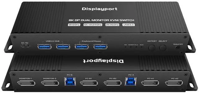 he Dual Monitor kvm Switch displayport has four switching modes, Mouse hotkey ,Keyboard hotkey,Boutton switching,wired switching .