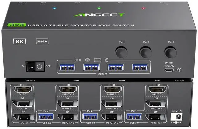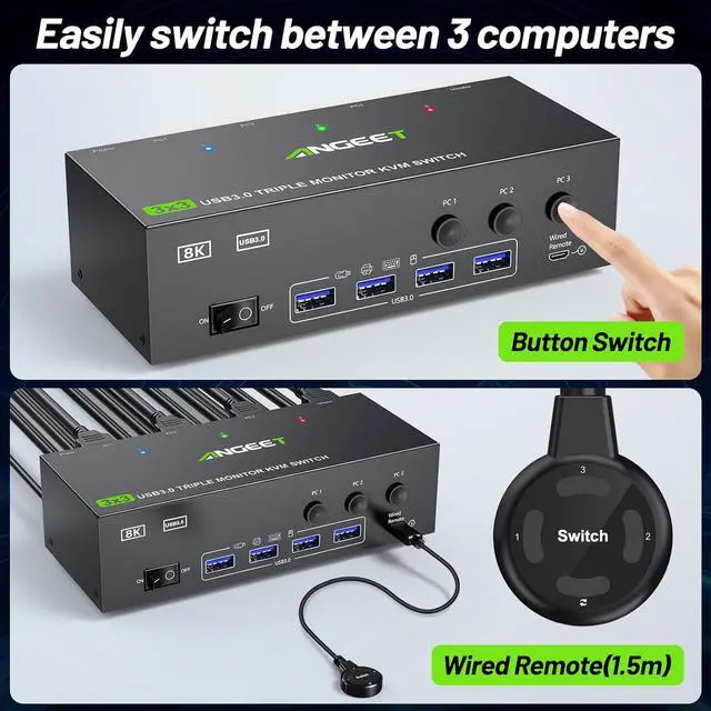 15Gbps ultra fast28K Ultra HDKVM triple monitors support extended and mirror display.Support wired or wireless keyboard and mouse.Cross support most major OS including Windows, Linux, Mac OS.USB KVM switch with 4 USB 3.0 ports for keyboard, mouse, printer, etc.Switching modes: Button switch and wired remote (1.5m),switch between 2 computers just need 2-4 seconds, fast and convenient.1*HDMI+2* Displayport KVM Switch : support resolution up to 8K@60Hz/4K@60Hz; support resolution up to 8K@30Hz/4K@144Hz. NOTE: