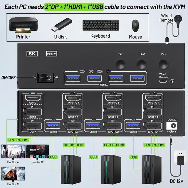 Each PC must have 1*HDMI+2*Displayport +1* USB cable to connect the 3 monitor KVM switch,OUT A, OUT B, OUT C connect to 3 monitors.