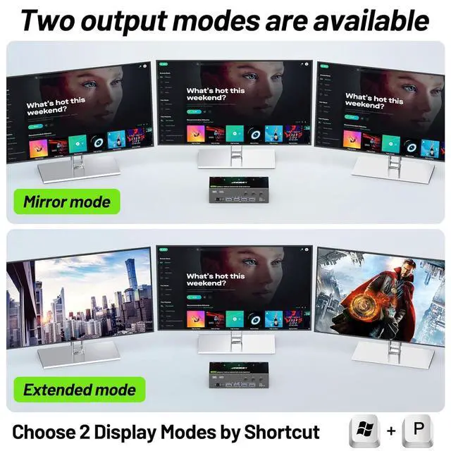Extended mode: 3 monitors output different screens Triple monitor KVM switch driver-free for Windows, Mac OS, Linux and Chrome OS, Compatible with Mini Box, PC, Laptop.4 USB ports use for external USB devices. It is widely applied for home, office, teaching, meeting room, games, etc.
