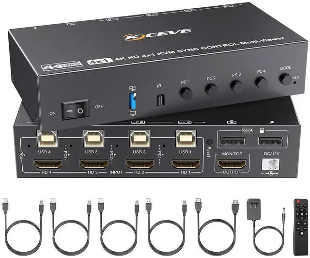 What's in the Box & 1 Year Warranty1*4K KVM Switch;4*USB A-B Cable;1*HDMI Cable;1*IR Remote(AAA batteries not included);1*User Manual. We will provide Lifetime support + 1-year warranty. Contact us anytime for presales or postsales help!