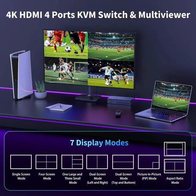 7 Smart Display ModesInstantly switch KVM Mode/Split Screen Mode. KVM Switch HDMI includes 7 layouts in total: Single Screen/Four-Screen/One Large and Three Small/PIP/Left and Right/Top and Bottom/Aspect Ratio.