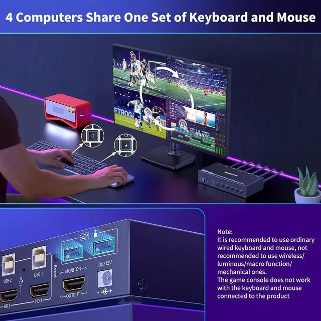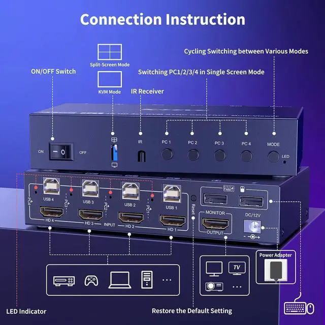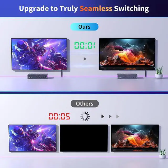Seamless Switching By 3 WaysExperience true zero-lag transitions between computers. Effortless Switching through: Device Buttons, Hotkeys, or IR Remote(AAA batteries not included). Feel free to pick your favorite way.