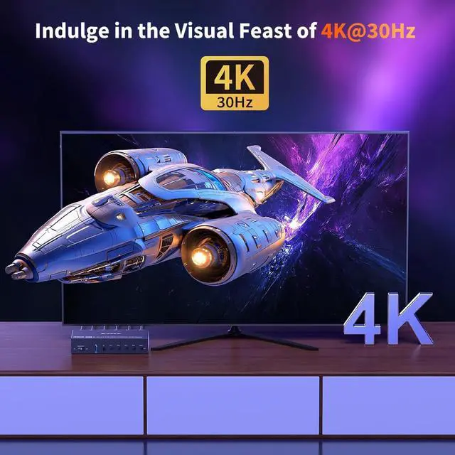 Crystal-Clear 4KUp to 4K@30Hz resolution, whether it's a form, design, video or game, HDMI Switcher 4 in 1 out lets you enjoy the ultimate visual world, seeing all the details with ease.