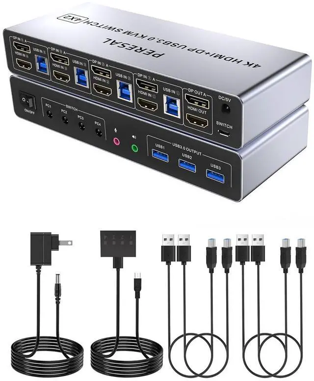 4 Port USB 3.0 Displayport HDMI Dual Monitor KVM Switch This 4 port dual monitor KVM allows you to use a set of keyboard and mouse to control 4 computers, share 3 USB devices and 2 monitors