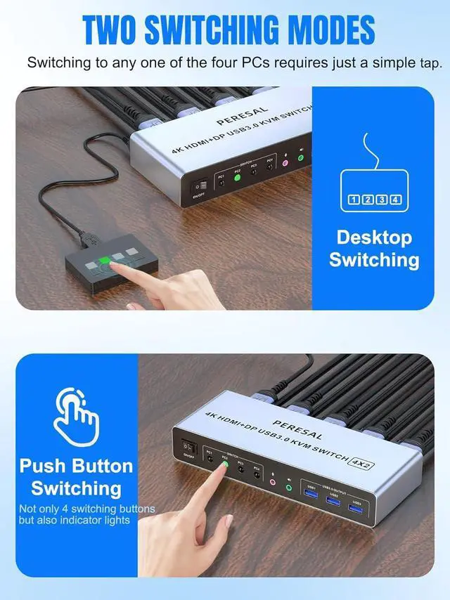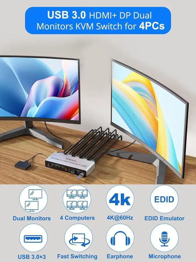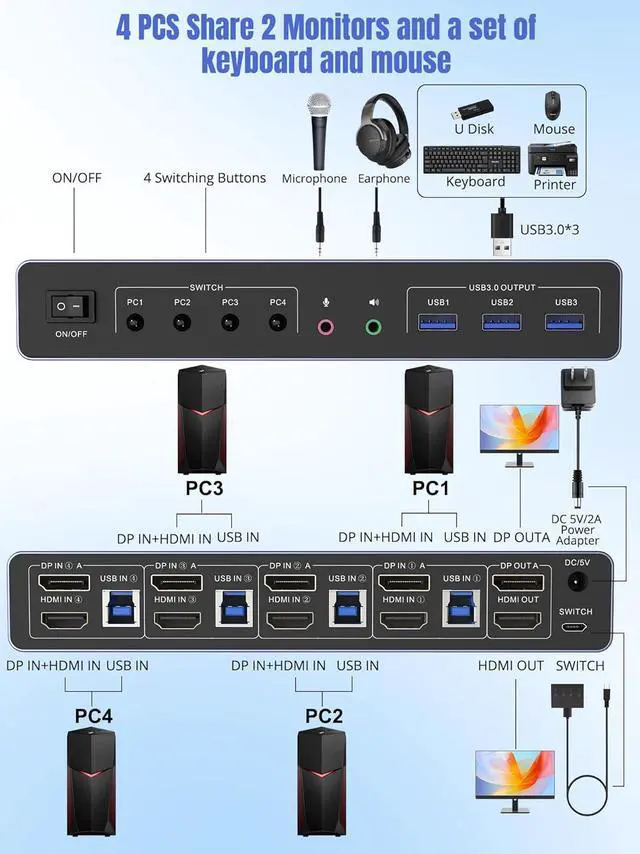 Displayport HDMI KVM Switch 4 Ports with 3 USB 3.0 Ports This 4 computer 2 monitor kvm comes with 3 USB 3.0 ports for sharing USB devices, such as keybaord, mouse, scanners, printers, U disks and more other USB devices. This KVM Switches also supports a variety of input devices, such as PC, Laptop, PS4, etc. Compatible with a variety of computer systems like Windows 7/8/10/11/Vista/xp, Linux, Mac, and so on