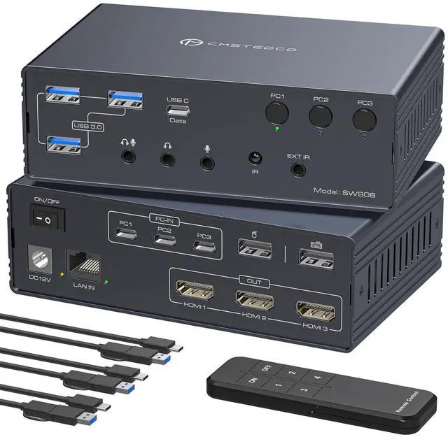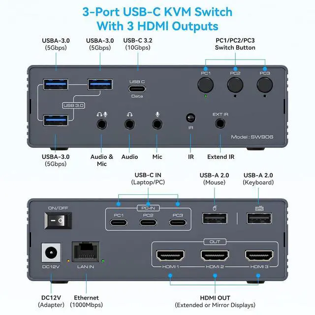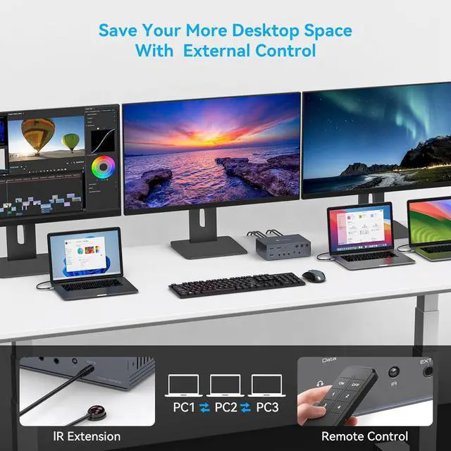 Effortlessly Manage Three Computers: Connect three laptops and three 4K@60Hz HDMI displays via the KVM Switches. Manage all devices with a single keyboard and mouse, making multitasking more efficient and organized. Eliminate the need for constant cable swapping, ensuring a seamless workflow. Note: Does not support keyboard shortcut (hotkey) switching functionality.