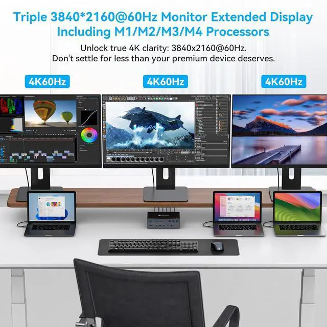 Triple 4K@60Hz Extended Display for Mac & PC Compatibility: Overcome Mac OS's inherent display limitations to enjoy stunning 3840*2160@60Hz triple-screen extended display. Fully compatible with macOS (MacBook, MacBook Air/Pro, Mac Mini equipped with M1/M2/M3/M4 chips) and Windows computers. Every frame delivers razor-sharp clarity, vibrant tones, and lifelike colors, with detail rendering far surpassing 1080p or 1440p resolutions. Note: Achieving 4K@60Hz operation requires a high-quality HDMI 2.0-compatible cable (recommended length: no longer than 3.3 feet).