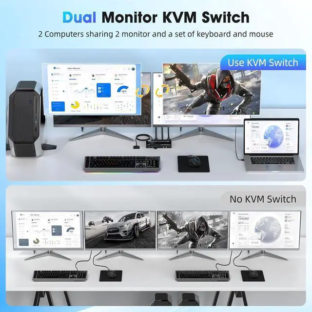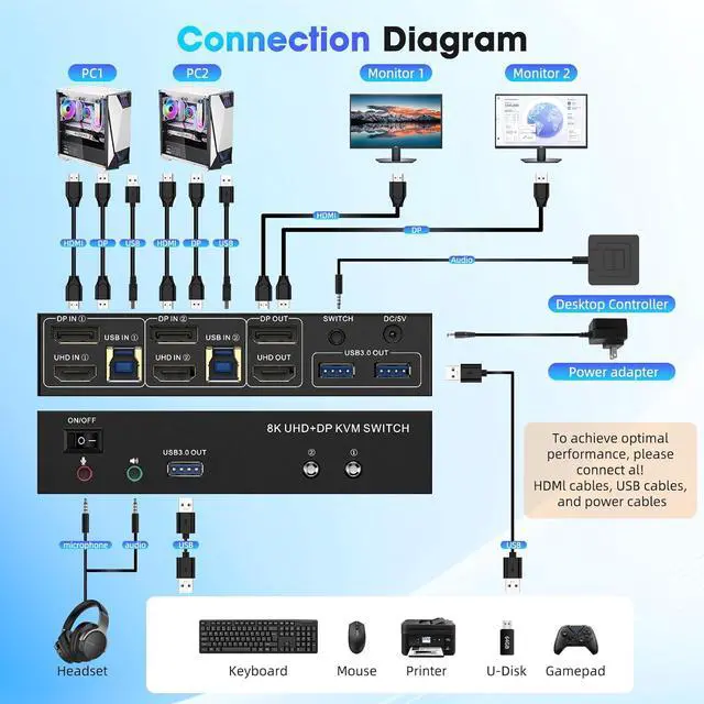 2.Ensure each computer is properly connected to the KVM switch withHDMI &DP cables and 1 USB-B cable.