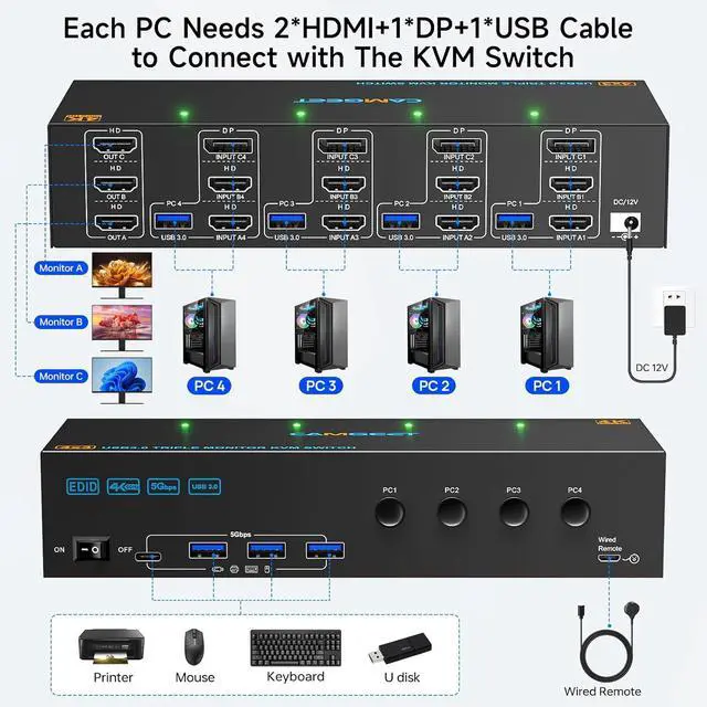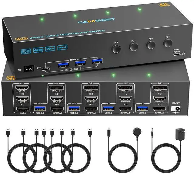 Camgeet USB3.0 triple monitor KVM switch can control 4 computers to share 3 monitors and 4 USB devices with just one set of keyboard and mouse. You can also use various combinations, such as 4 PC share 2 monitors, 4 PC share 1 monitor, 2 PC share 2 monitors... etc