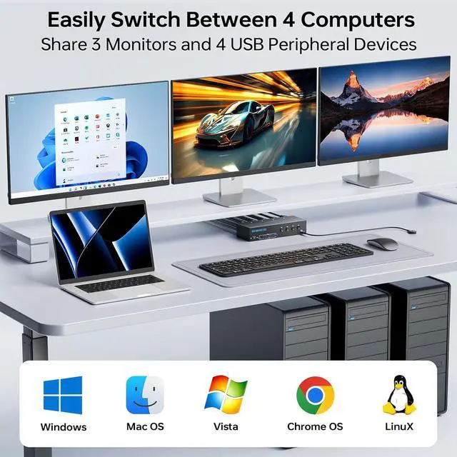 HDMI Displayport KVM switch 4 computers 3 monitors driver-free for Windows, Mac, Linux, Unix, Ubuntu and most other major operating systems.