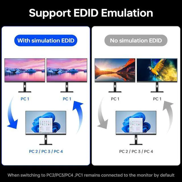 This 3 monitors KVM switch features EDID emulation, when the monitors are switched between 4 computers, the original window position will not be changed, while other KVM switch require the user to rearrange the window order.