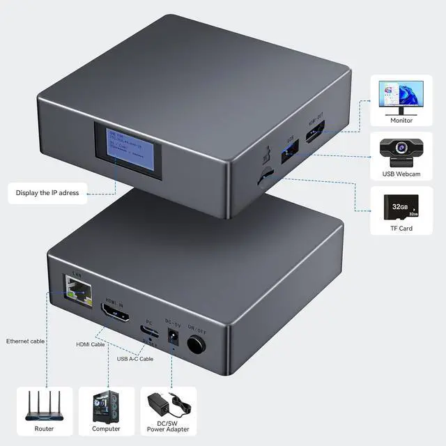 The upgraded version of Remote KVM over IP features a mini screen design, Automatically recognize and display IP addresses, and this IP KVM also supports fixed IP settings.