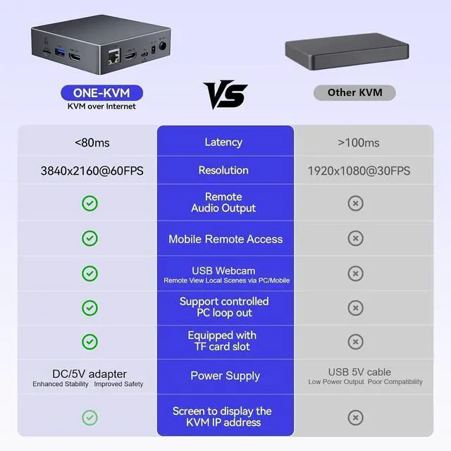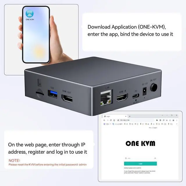 Control remotely via web or APP(ONE KVM)APP supports use on LAN or WAN,it's just so convenient. Note: Web can only be used on LAN.