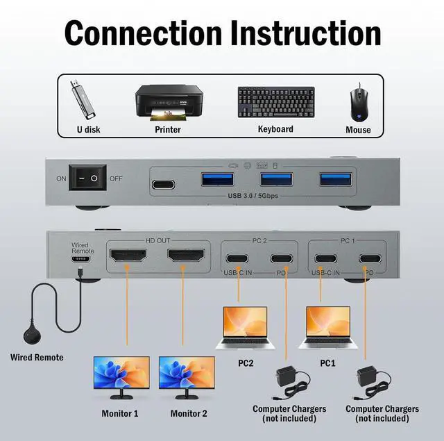 Rapid 80W PD ChargingDual monitor KVM is designed with a dedicated PD port for each laptop, you can charge your laptop while in use to cope with intense workloads and stay smooth. (Please use your computer's original charger).