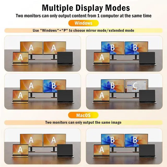 Smart Display ModesChoose between Mirror Mode or Extended Mode as you need. USB C switcher 2 computers maximizes efficiency whether you are entertaining or running a job. Note: For macOS, 2 monitors can only present the same content.