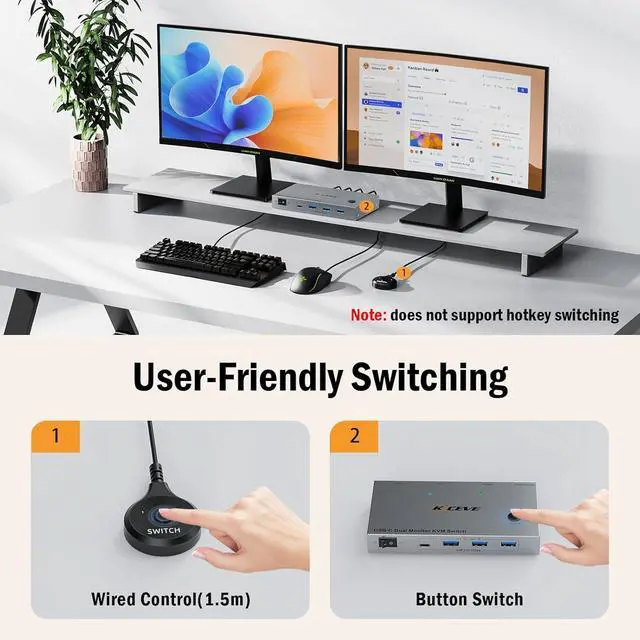 2 Flexible Switch WaysSwitching HDMI KVM Switch 2 Monitors is easy at the touch of a hub button or with the convenient 1.5 meter remote control, from any position, for convenience and desktop tidiness.
