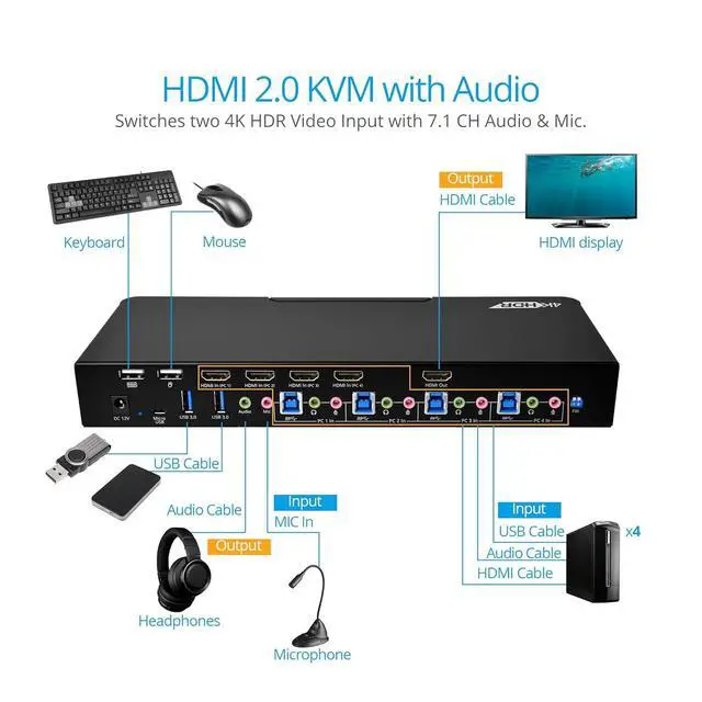 gofanco Prophecy 4-Port HDMI 2.0a USB KVM Switch connects a keyboard, a mouse, and a 4K @60Hz compatible display to up to four HDMI sources, plus 4 additional USB ports for expanded capabilities. Seamless switching allow for easy access between the two four sources, designed to maximize efficiency and productivity.