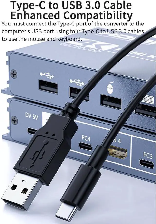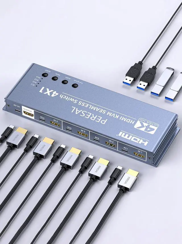 • 4 Port HDMI KVM SwitchThe HDMI kvm switch 4 port allows 4 computers to share one monitor and 4 USB 3.0 devices, One set of keyboard and mouse to control 4 computers at the same time. Support mouse crossing & roaming in 4 Equal Screen Mode. avoid frequently plugging and boosts office efficiency