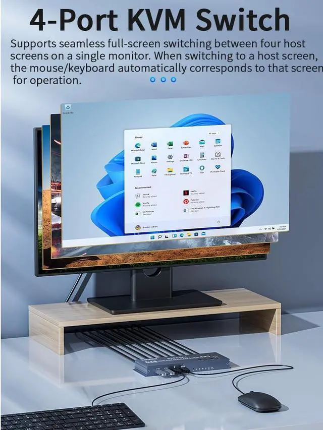 4 Port HDMI KVM SwitchThe HDMI kvm switch 4 port allows 4 computers to share one monitor and 4 USB 3.0 devices, One set of keyboard and mouse to control 4 computers at the same time. Support mouse crossing & roaming in 4 Equal Screen Mode. avoid frequently plugging and boosts office efficiency