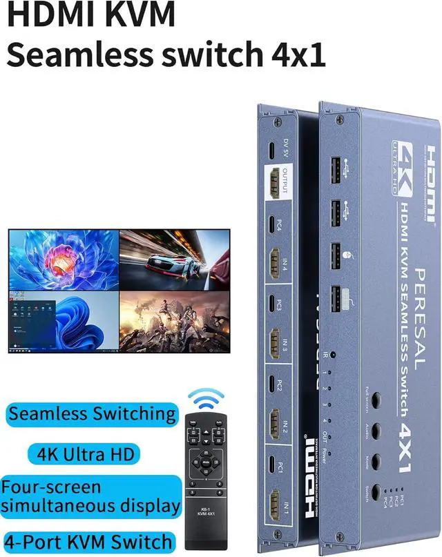KVM Control and Remote ControlSupport Button + Remote + Hot-key seamless switching. 4x1 Quad Multi-Viewer with function buttons and attached IR remote control, suitable for remote control.