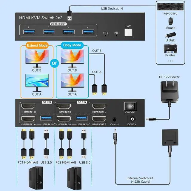 KVM Switch Dual MonitorThis HDMI KVM Switch supports two PCs to share dual monitors and four sets of USB 3.0 devices. Allows you to control two computers sharing two monitors with just one set of keyboard and mouse