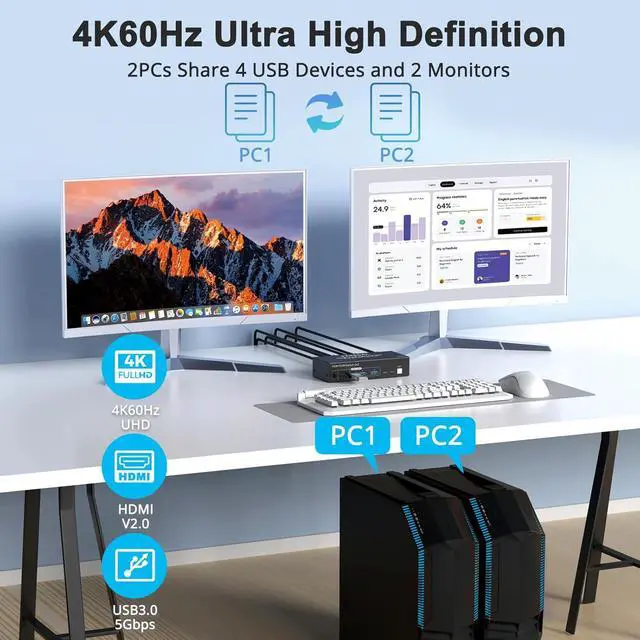 Ultra HD 4K60Hz SwitchThis 4K Dual Monitor KVM Switch supports a resolution of up to 4K60Hz and can transmit impressive high-quality UHD video,bringing an exquisite and realistic visual experience.It is also downward compatible with 2K144Hz,1080P,etc.