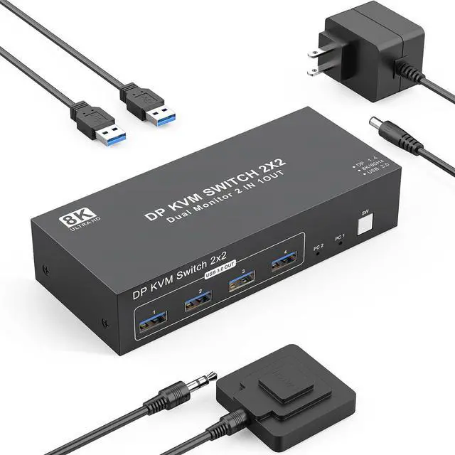 What will you Get:provides 1 year war-ranty technical support for this 8K Displayport KVM Switch. PACKAGE LIST:1* 8K DP USB3.0 KVM switch; 2*USB Cable(1M); 1*Wired Remote(1.5M); 1*12V Power adapter and 1*User Manual.Any problem,pls tell us to solve