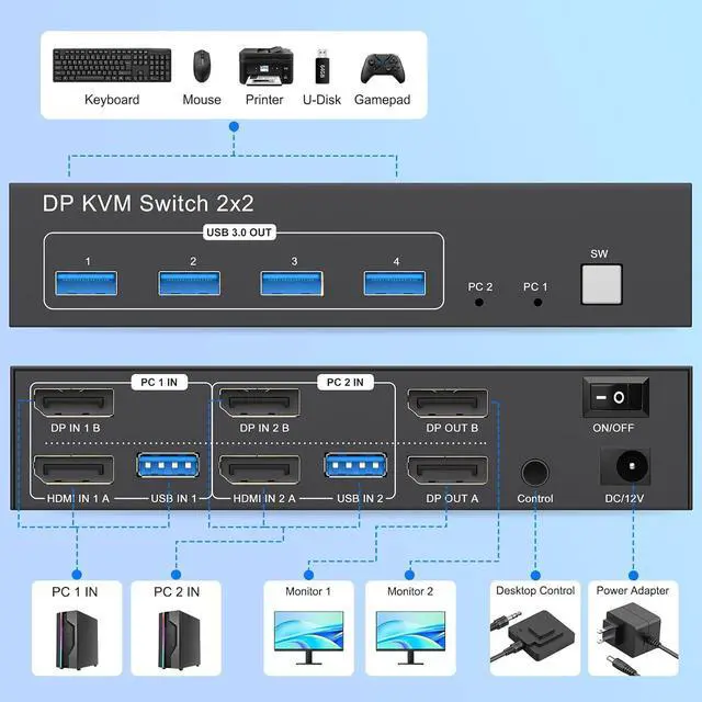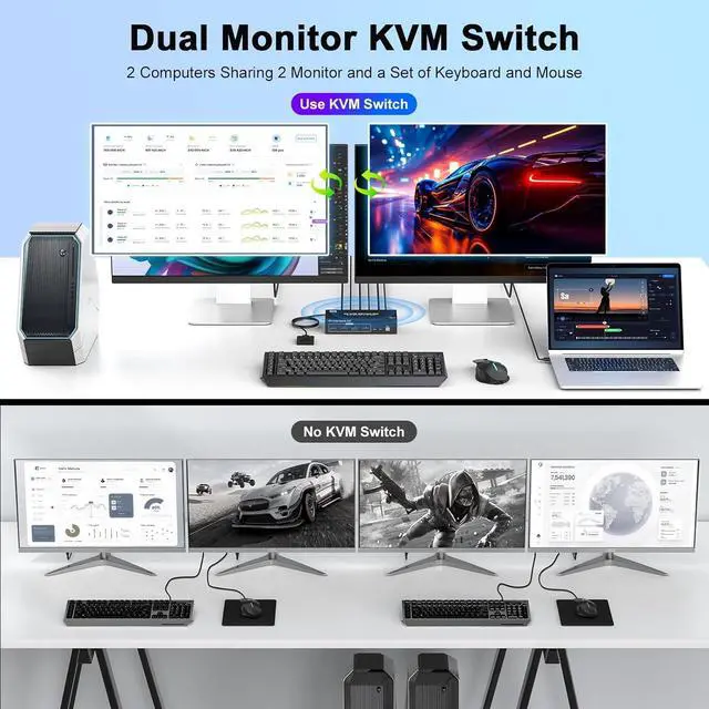 Display Port KVM Switch: This kvm switch 2 monitors 2 computers display port allows seamless control of 2 computers sharing 2 monitors and 4 USB 3.0 devices along with a single keyboard and mouse It supports flexible switching between extended mode (displaying different content on dual screens) and mirror mode (duplicating identical content)