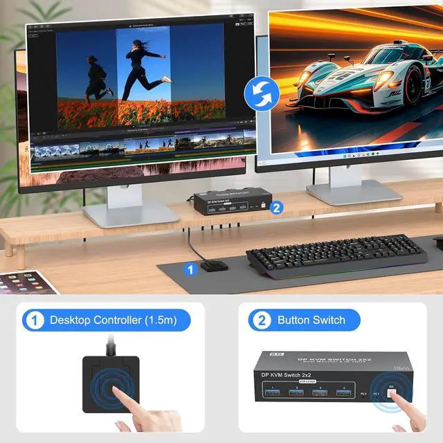 Great Compatibility & 2 Switching Mode:This two monitor displayport kvm switch driver-free for Windows, Mac OS, Linux and Chrome OS. Compatible with PC, Laptop,TV Box. It is widely applied for home, office, teaching, games, etc.You can press the button on the panel or use the wired remoteincluded to switch the computersLED indicate the active computer