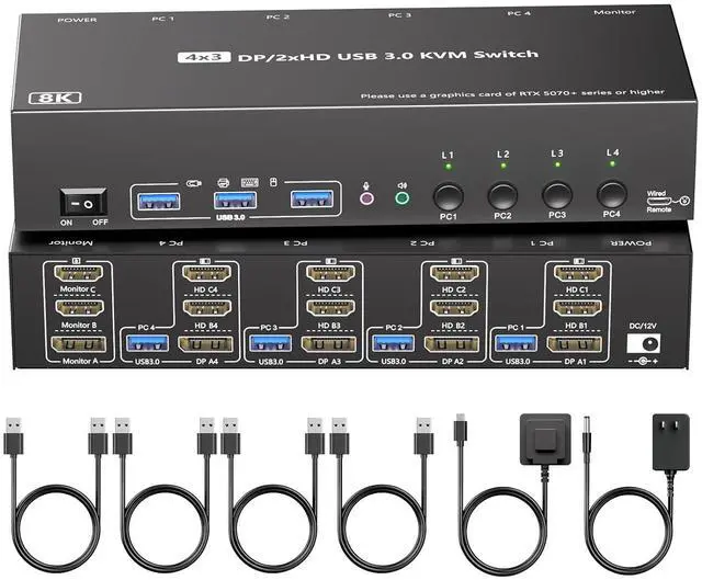 This 2 HDMI + Displayport triple monitor KVM switch is perfect for 4computers to share 3 monitors and 4 USB 3.0 devices.