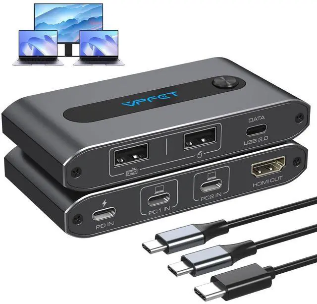 USB C KVM Switch for 2 Laptops 1 MonitorThis usb c kvm switch allows you to share one HDMI monitor, keyboard, and mouse between 2 computers via USB-C ports. Perfect for multitasking across two laptops or MacBooks. Easily switch between devices with a single button, improving work efficiency. Note: It is not recommended to use an adapter cable for connection