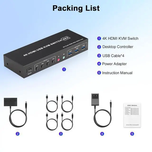 What will you Get:CCONG provides 1 year war-ranty technical support for this 4K HDMI KVM Switch. PACKAGE LIST:1*4K UHD USB3.0 KVM switch; 4*USB Cable(1M); 1*Wired Remote(1.5M); 1*5V Power adapter and 1*User Manual.Any problem,pls tell us to solve