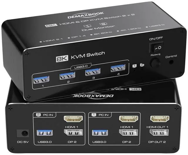 8K@60Hz & 4K@144Hz Display One-Click ON/OFF Switch 1.5m Wired Remote Switch Includes 5V2A Power Adapter Extended &Mirror Mode Do both computers need to have 2 video outputs (HDMI + DP) to use this KVM switch?