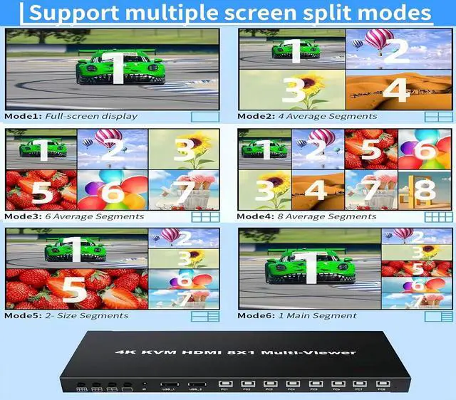 4K KVM HDMI 8x1 Quad Multi-viewer is a high performance with 8 HD screen segmentation and seamless switching output
