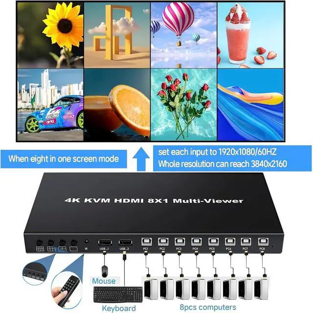 Support through the USBinterface, connect 8 computers, sharing a set of mouse and keyboard Support highest resolution up to 4K30hz I Support IR control Compatible HDMI1.4