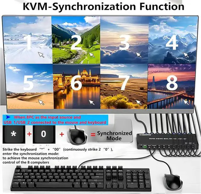 (2) Synchronization function: Keyboard strike * + 00 (two consecutive 0), enter synchronization mode,the mouse can synchronize control of 8 computers.