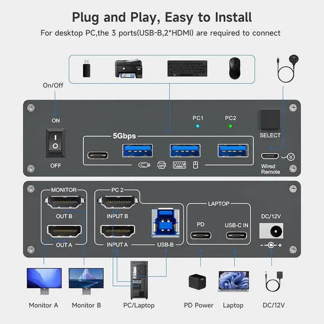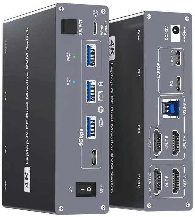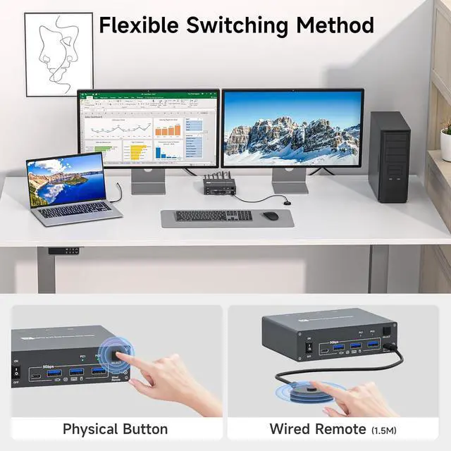 The 2 monitors 2 computers USB-C docking KVM switch is equipped with DP-Alt USB-C 3.1 Gen 2 port and dual HDMI ports, it's perfect for one laptop and one desktop PC to share 2 external monitors and 4 USB peripherals like keyboard mouse, printer, scanner, hard drive,ect