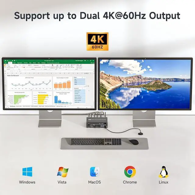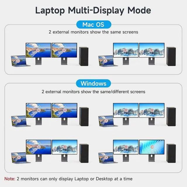 Laptop & Desktop Dual Monitor USB-C Docking KVM Switch Laptops Support Different Display Modes Based on Different OS Plug and Play, Easy to Install Free from Repeated Plugging and Unplugging, Get a Tidy & Efficient Workspace