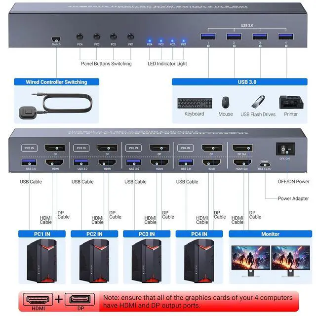 1. Each PC needs both HDMI and DP portsconnect both to this 4 computer KVM switch for dual-monitor magic. Skipping one port? Only one screen will work. Ideal for multi-tasking: code on one monitor, stream on the other.