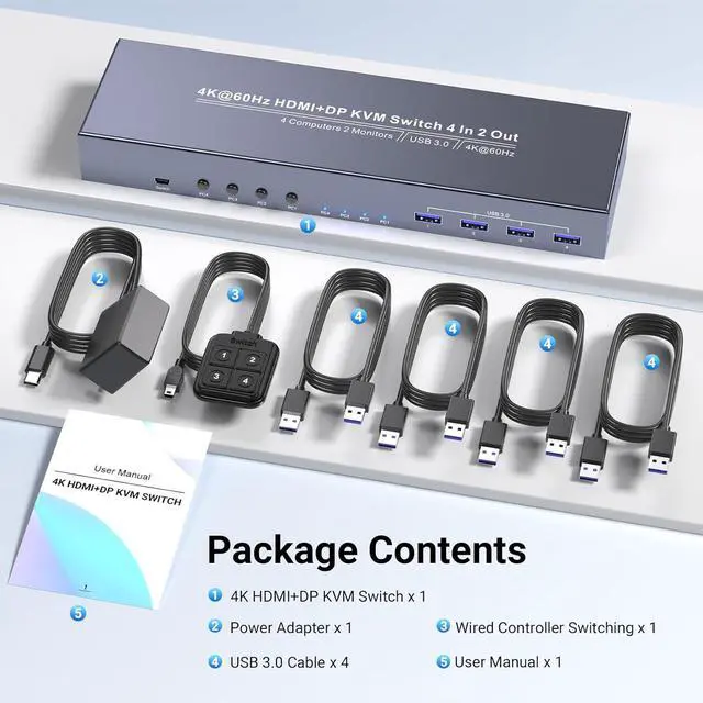 4K@60Hz HDMI + Displayport KVM Switch 2 Monitors 4 Computers with 4 Port USB 3.0 for Peripherals 4 In-1 Command Center for Controlling 4 Computers on Dual Monitors HDMI DisplayPort KVM Switch for 2 Monitors & 4 Computers - Dual Monitor Setup 4K@60Hz Visuals That Blow Your Mind HDMI and DisplayPort Connectivity for Each Computer Blazing-Fast USB 3.0 for All Your Gear