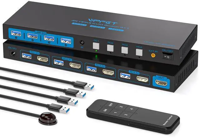 KVM Switch 4 ComputersThe hdmi kvm switch 4 computers 1 monitor allows 4 computers to share a single monitor and a set of keyboard, mouse and up to 4 USB devices. It's complete USB switch and HDMI switch rolled into one. Simply use the remote control or the switch buttons on the panel to easily switch between the 4 computers without any complicated operations, saving costs, simplifying your workspace, and improving work efficiency. Note: Each PC and monitor must be equipped with an HDMI port for proper operation.