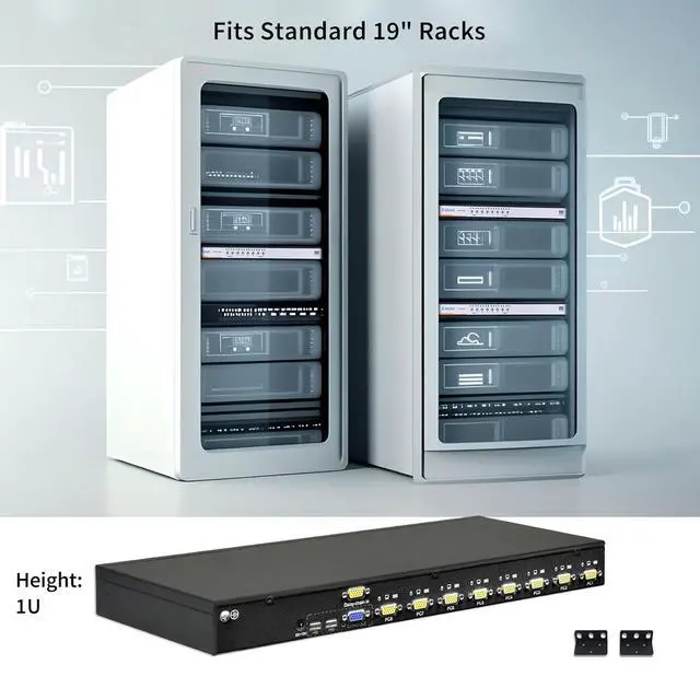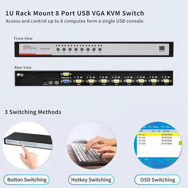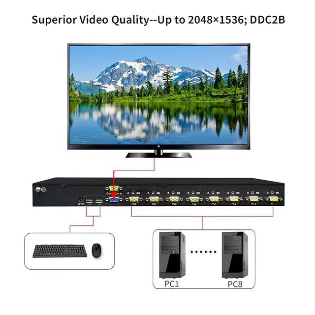 This 8 Port VGA KVM Switch provides a highly effective solution for centralized computer management, allowing you to control up to 8 different computers using just one set of USB keyboard, mouse, and VGA monitor. By consolidating multiple systems into a single console, it significantly declutters your workspace, eliminates the need for multiple peripherals, and streamlines workflow efficiency.
