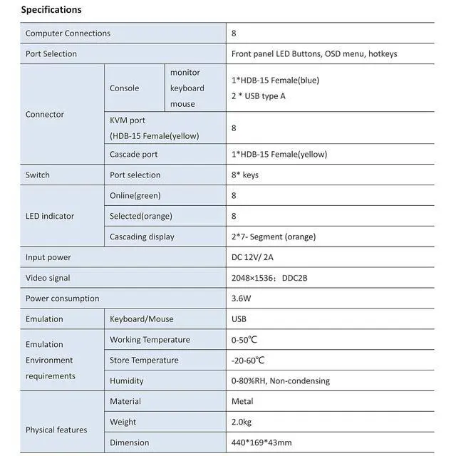 Designed with user convenience in mind, this KVM includes an intuitive OSD menu for visual port management and allows for easy customization of hotkeys and scan settings. For larger installations, its daisy-chaining capability enables control of even more computers across multiple units. The 8 Port VGA KVM Switch combines advanced functionality with straightforward operation, providing a reliable and scalable central management system for your multi-computer setup, enhancing both control and productivity.