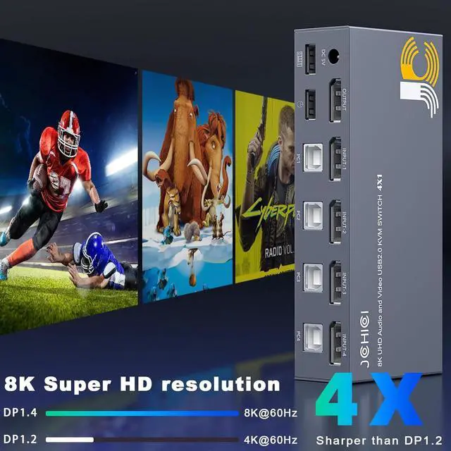 8k@60Hz Displayport1.4 KVM switch 4x1 One Switch, Endless Possibilities Tailor-made Switching Declutter Your Desk, Delight Your Mind! Remote Control Freedom Compact Yet Classy Compatible with HDR video One Switch, Any OS