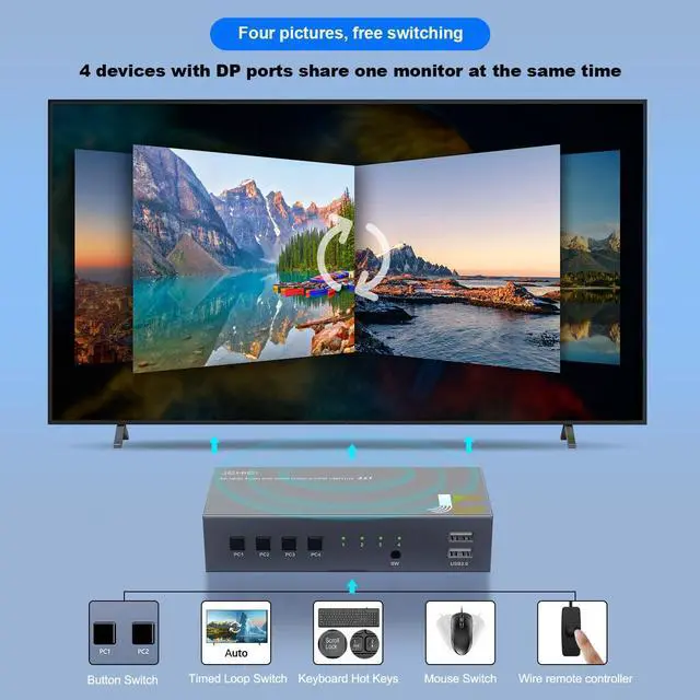 Say goodbye to the hassle of switching between multiple DisplayPort computers. With the DP kvm switcher 4x1, you can easily control 4 computers with one keyboard, mouse and monitor. Whether you need to work, play, or multitask, you can enjoy the stunning 8K@60Hz resolution.