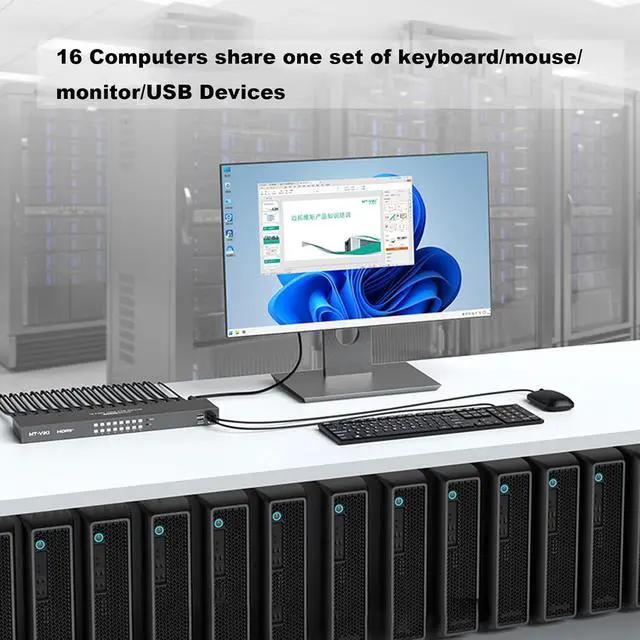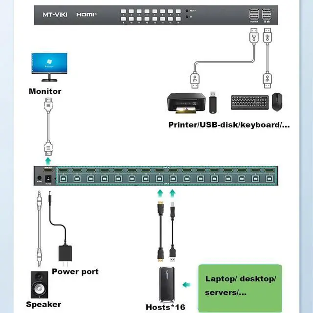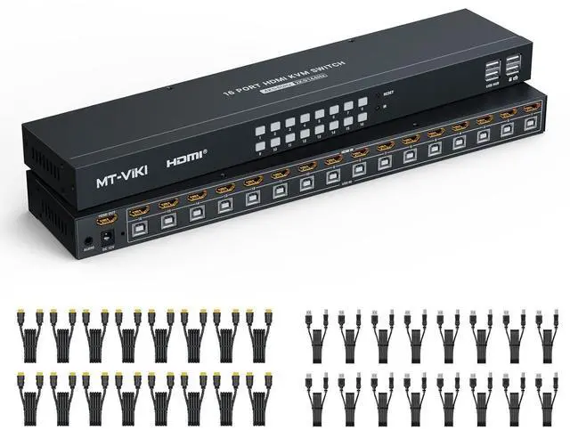 Great CompatibilityJust plug and play, KVM switch HDMI 16 port driver-free for Windows, Mac OS, Linux and Chrome OS.USB HDMI KVM is also compatible with most HDMI source devices, such as PS5, PS4,TV Box, PC, Laptop. It is widely applied for home, office, teaching, meeting room, server room, etc. Supports USB-C/Displayport/VGA to HDMI converter or cable.