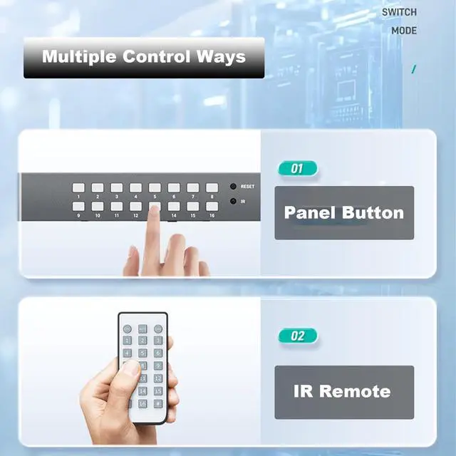 16 Port HDMI KVM SwitchThis 16 ports KVM switch can control up to 16 computers to share 1 monitor with 1 set of keyboard mouse. You can easily switch by panel button or IR remote between 16 computers on 1 monitor and share 4 USB 2.0 devices,LED lights indicating the active computer.
