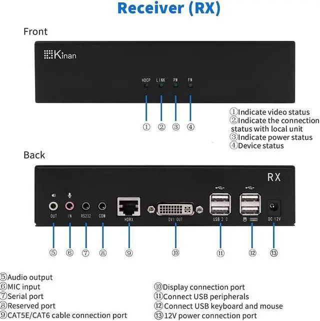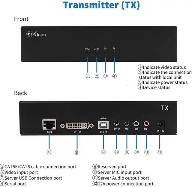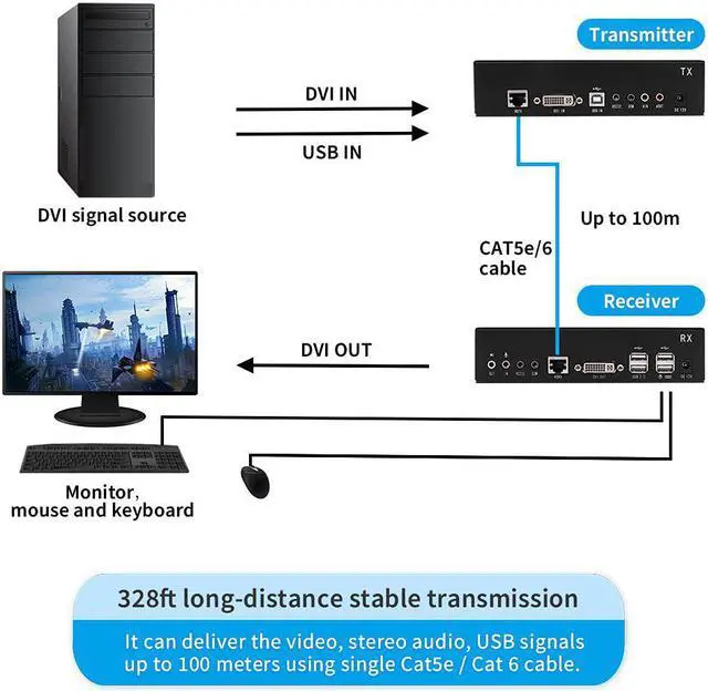 328ft Long-Distance Stable Transmission: This USB DVI KVM extender kit(Transmitter + Receiver) delivers HD DVI video, USB, and stereo audio signals up to 328ft(100m) via a single CAT5/5e/6 cable. Zero latency and no compression.Efficiently extend your keyboard, mouse, and monitor away from your PC or server, enhancing workspace flexibility.
